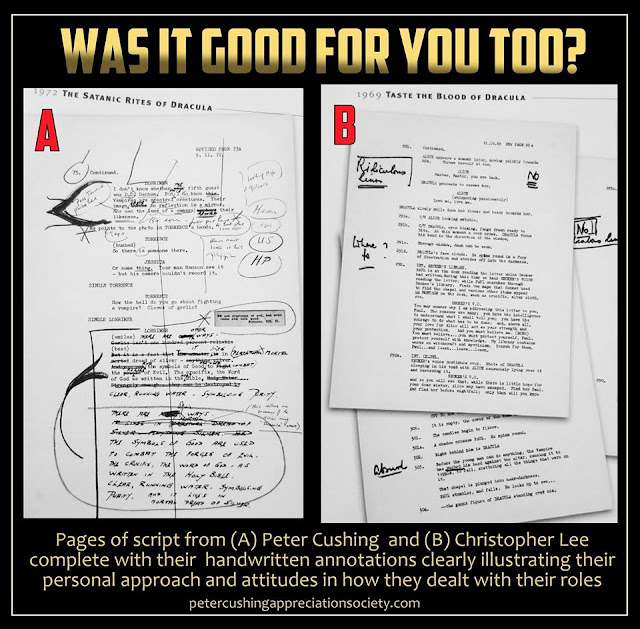 TWO PAGES from Peter Cushing and Christopher Lee's scripts. BOTH from Hammer Dracula films. Cushing's from 'The Satanic Rites of Dracula' (1973) and Lee's 'Taste the Blood of Dracula' (1970) BOTH films had a trying and difficult 'birthing' process . . I think for both Cushing and Lee, making a Hammer Dracula film, was a different experience. . . but it is now, both interesting and quite amusing how Lee and Cushing dealt with prep for the role, short-falls of the script, the detail, the dialogue... Cushing as we know, loaded his scripts with yards of notes, references, costume suggestions and anything that would aid him in doing his best on the screen.. he was quite meticulous.